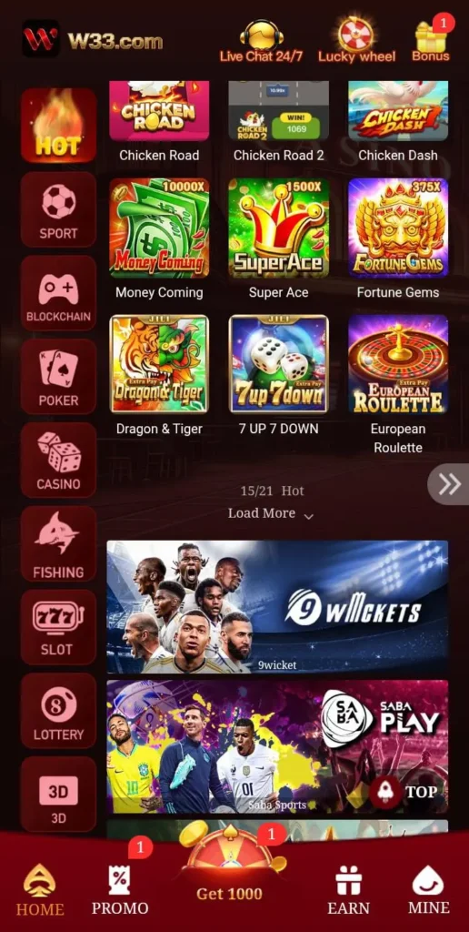 W33 Game is an online gaming application that provides slot games, card games, and other casino-style entertainment. Players can join the platform by creating an account on the app. After that, they can explore different games and try their luck.